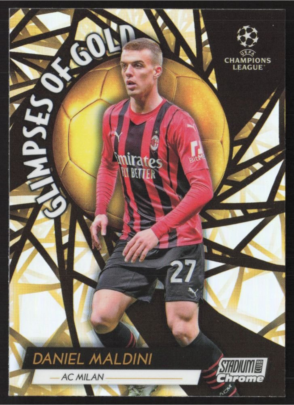 Tato kartička z edice 2021-22 Topps Stadium Club Chrome UEFA Champions League představuje Daniela Maldiniho, talentovaného hráče, který se proslavil svými výkony na evropské scéně. Kartička #GG-DM je součástí prestižní sběratelské série, která zachycuje nejlepší momenty a hráče v historii fotbalu.