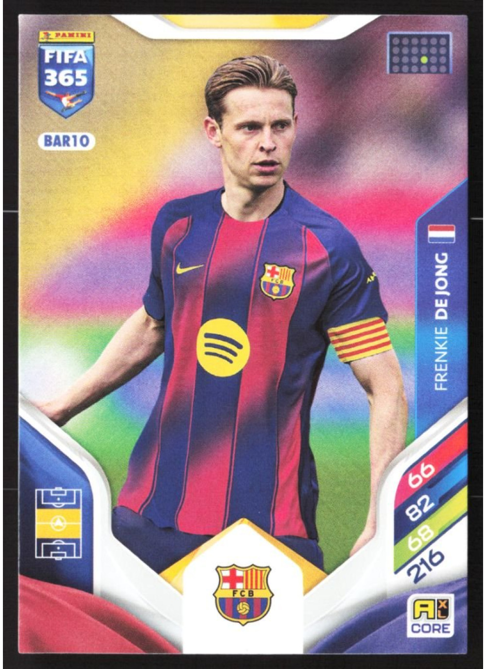 Kartička 2026 Panini Adrenalyn XL FIFA 365, #BAR10, představuje jednoho z nejvýznamnějších hráčů současnosti, Frenkieho de Jonga. Tento talentovaný záložník, který hraje za FC Barcelona, se stal klíčovým hráčem nejen v klubu, ale i v národním týmu Nizozemska. Jeho technické dovednosti a schopnost číst hru z něj dělají jednoho z nejžádanějších hráčů na trhu sběratelských kartiček.