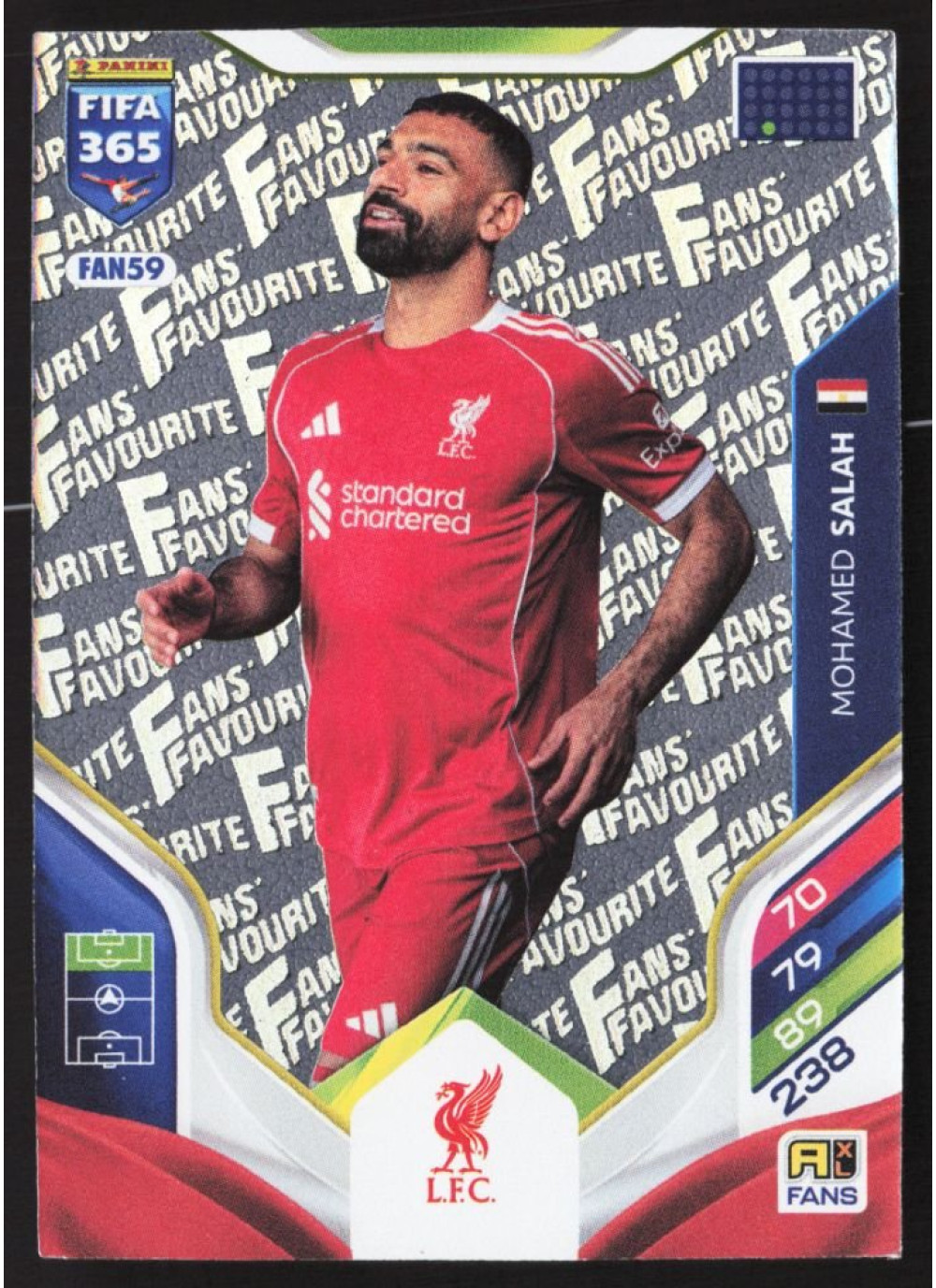 Kartička 2026 Panini Adrenalyn XL FIFA 365, #FAN59, představuje jednoho z nejvýznamnějších hráčů současnosti, Mohameda Salaha. Tato kartička je součástí sběratelské edice, která zachycuje klíčové momenty a hráče sezóny 2026.