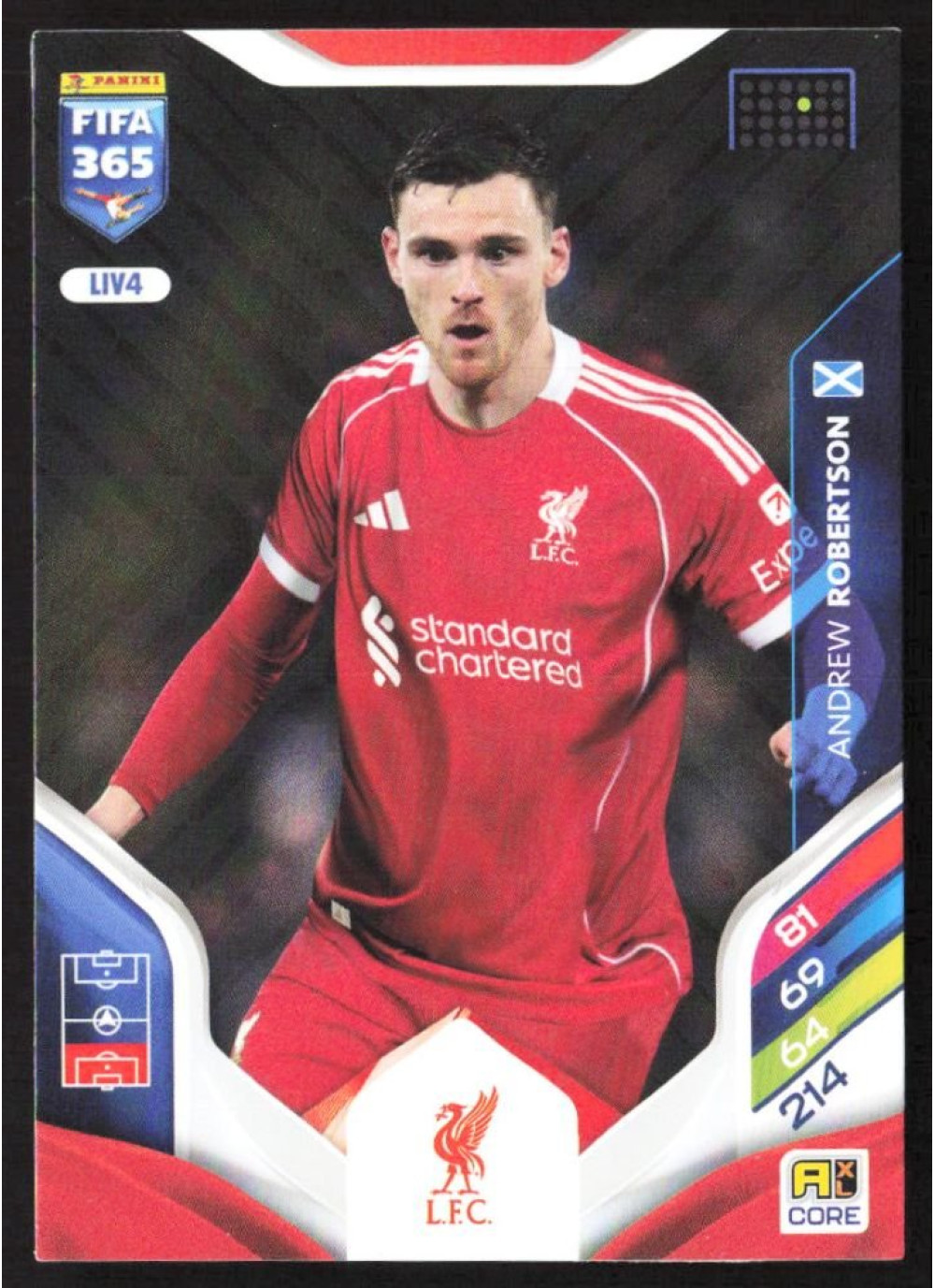 Kartička 2026 Panini Adrenalyn XL FIFA 365, #LIV4, představuje jednoho z nejvýznamnějších hráčů Liverpoolu, Andrewa Robertsona. Tento skvělý obránce se proslavil svými vynikajícími výkony na hřišti a je klíčovým členem týmu. V sezóně 2026 se očekává, že bude hrát důležitou roli v boji o titul.