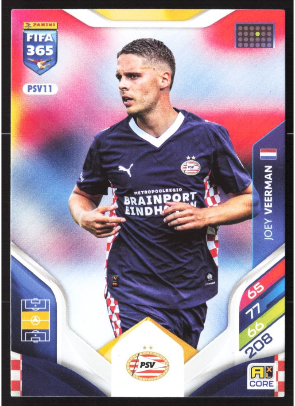 Kartička 2026 Panini Adrenalyn XL FIFA 365, #PSV11, představuje talentovaného hráče Joeyho Veermana, který se stal klíčovým členem týmu PSV Eindhoven. Tato kartička je součástí sběratelské edice, která zachycuje nejlepší momenty a hráče sezóny 2026. Nezmeškejte příležitost přidat tuto unikátní kartičku do své sbírky!