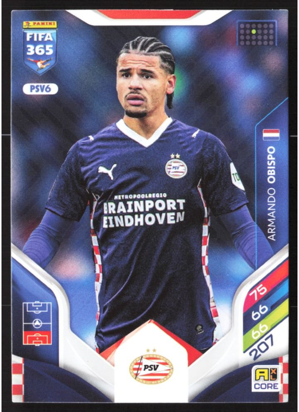 Kartička 2026 Panini Adrenalyn XL FIFA 365, #PSV6 představuje talentovaného hráče Armando Obispo. Tato kartička je součástí sběratelské edice, která zachycuje klíčové momenty a hráče sezóny 2026. Armando Obispo, známý svými vynikajícími obrannými dovednostmi, je jedním z nejvýznamnějších hráčů PSV Eindhoven a jeho karta je must-have pro každého fanouška.