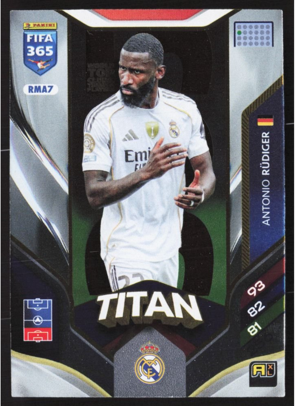 Kartička 2026 Panini Adrenalyn XL FIFA 365, #RMA7, představuje jednoho z nejvýznamnějších hráčů současnosti, Antonia Rüdigera. Tento obránce, známý svou silnou hrou a taktickým přehledem, je klíčovým členem týmu Real Madrid. Kartička je součástí sběratelské edice, která zahrnuje hráče z celého světa a nabízí fanouškům jedinečnou příležitost mít ve své sbírce kousek fotbalové historie.