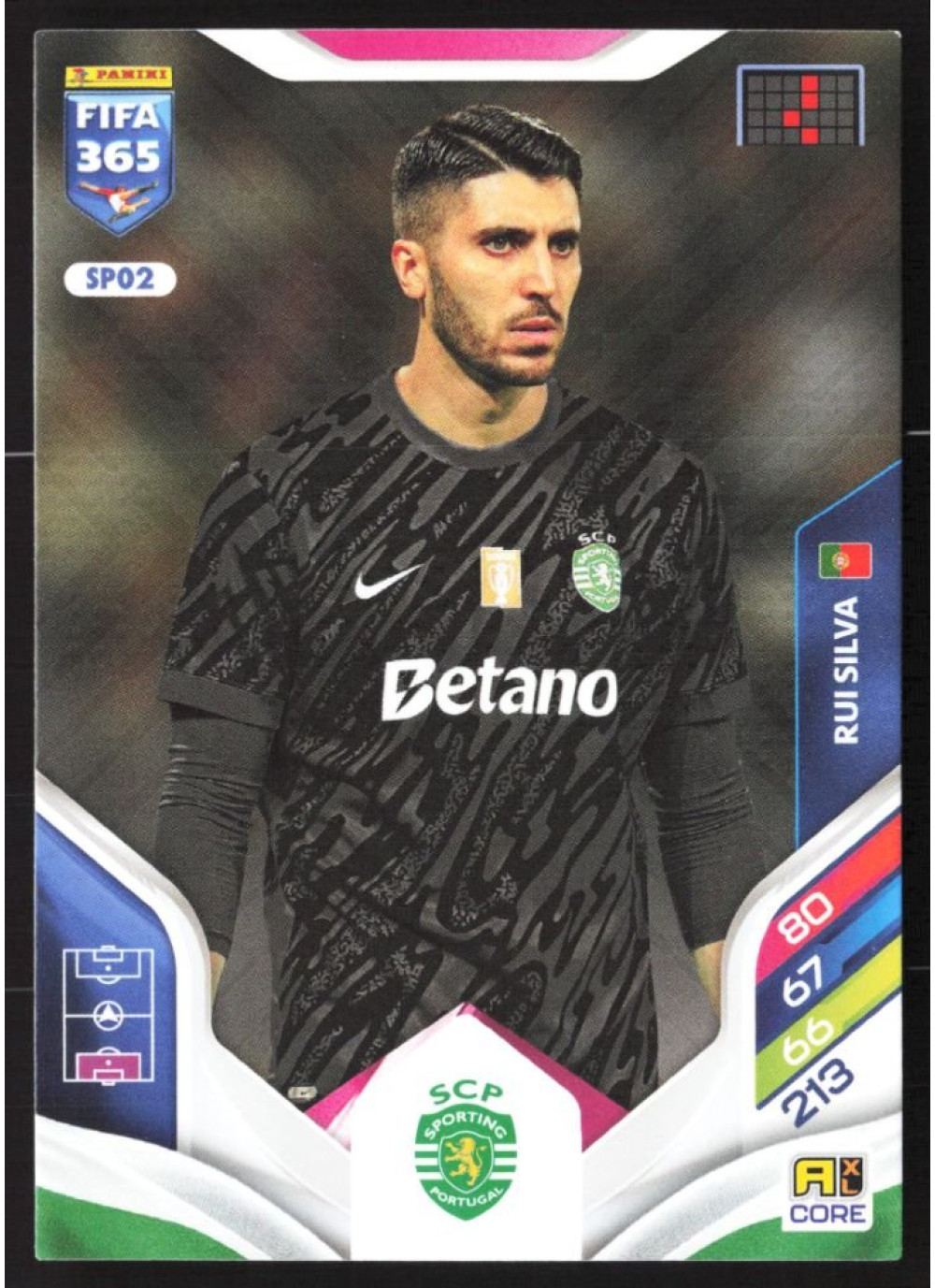 Kartička 2026 Panini Adrenalyn XL FIFA 365, #SPO2, představuje talentovaného brankáře Rui Silvu, který se proslavil svými výkony v poslední sezóně. Tato kartička je součástí sběratelské edice, která zahrnuje hráče z různých týmů a lig po celém světě.