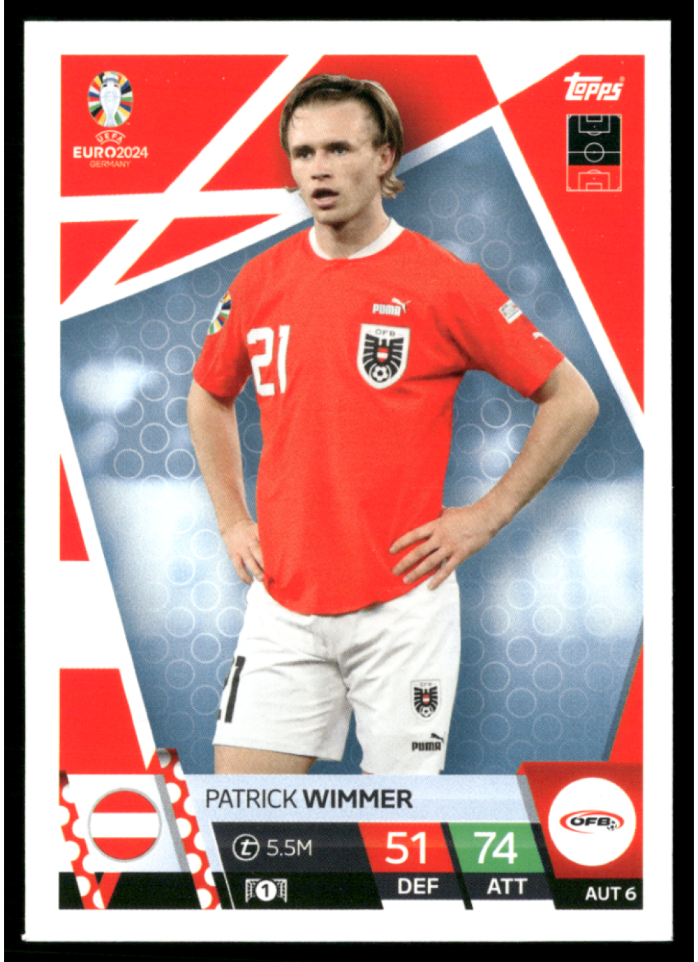 Kartička Topps Match Attax UEFA EURO 2024, #aut6, představuje jednoho z nejvýznamnějších hráčů turnaje, Patricka Wimmera. Tato kartička je součástí exkluzivní edice, která zachycuje vzrušení a rivalitu evropského fotbalu.