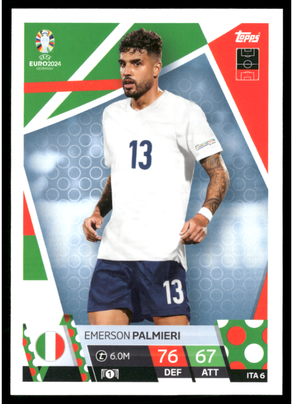Kartička Topps Match Attax UEFA EURO 2024, #ita6, představuje hráče Emersona Palmieriho, který je klíčovým členem italského národního týmu. Tato kartička je součástí sběratelské edice pro sezónu 2024, která zahrnuje nejlepší hráče z evropského fotbalu.