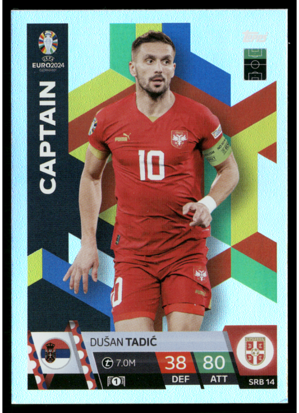 Kartička Topps Match Attax UEFA EURO 2024, #srb14, představuje jednoho z nejvýznamnějších hráčů turnaje, Dušana Tadiće. Tato kartička je součástí exkluzivní edice, která zachycuje klíčové momenty a hráče UEFA EURO 2024. Tadić, známý svými vynikajícími dovednostmi a schopností ovlivnit hru, je klíčovým hráčem pro reprezentaci Srbska.