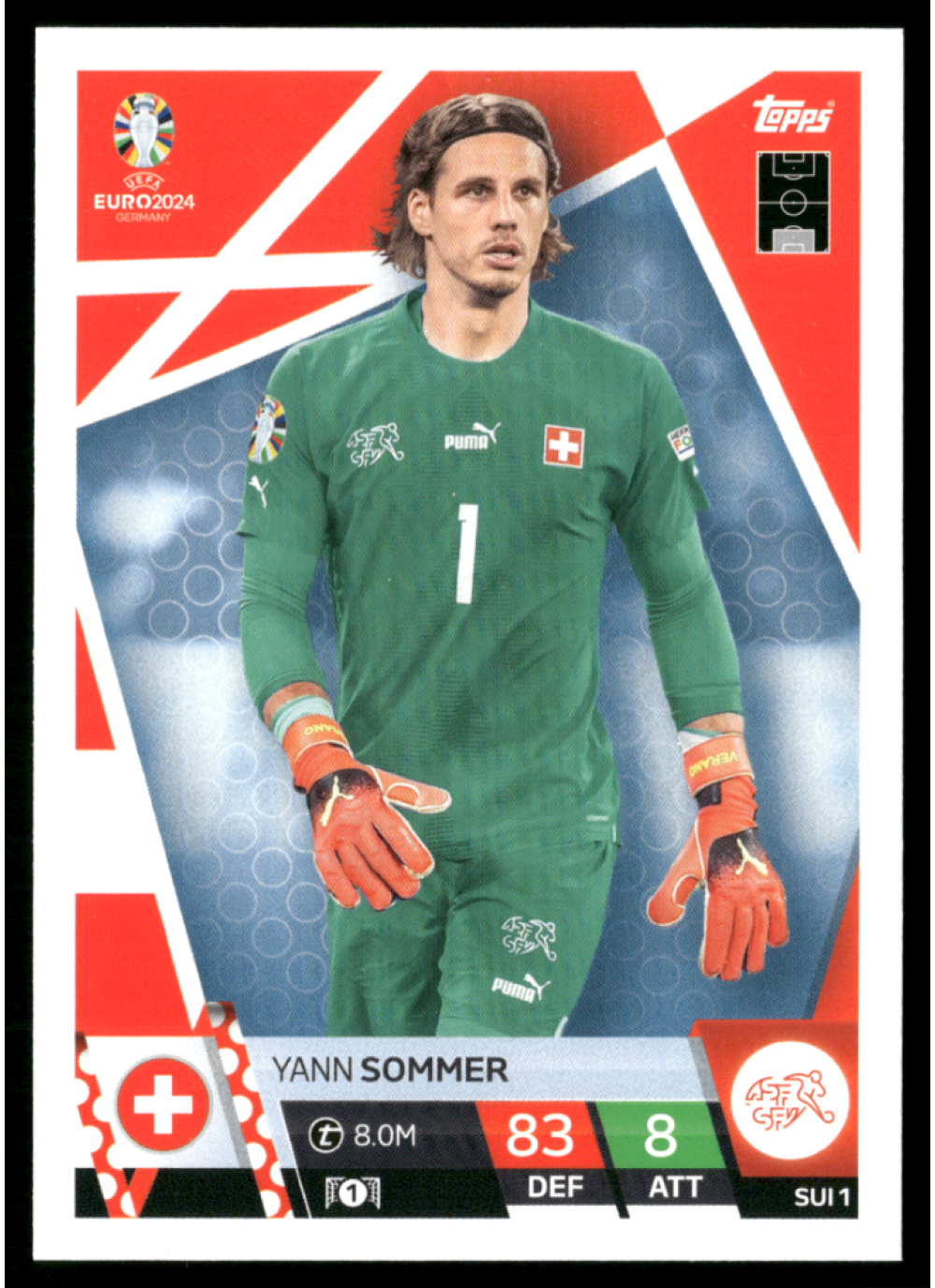 Kartička Topps Match Attax UEFA EURO 2024, #sui1, představuje jednoho z nejvýznamnějších hráčů turnaje, Yanna Sommera. Tento brankář, známý svými skvělými reflexy a schopností zastavit i ty nejtěžší střely, je klíčovým hráčem švýcarského národního týmu.