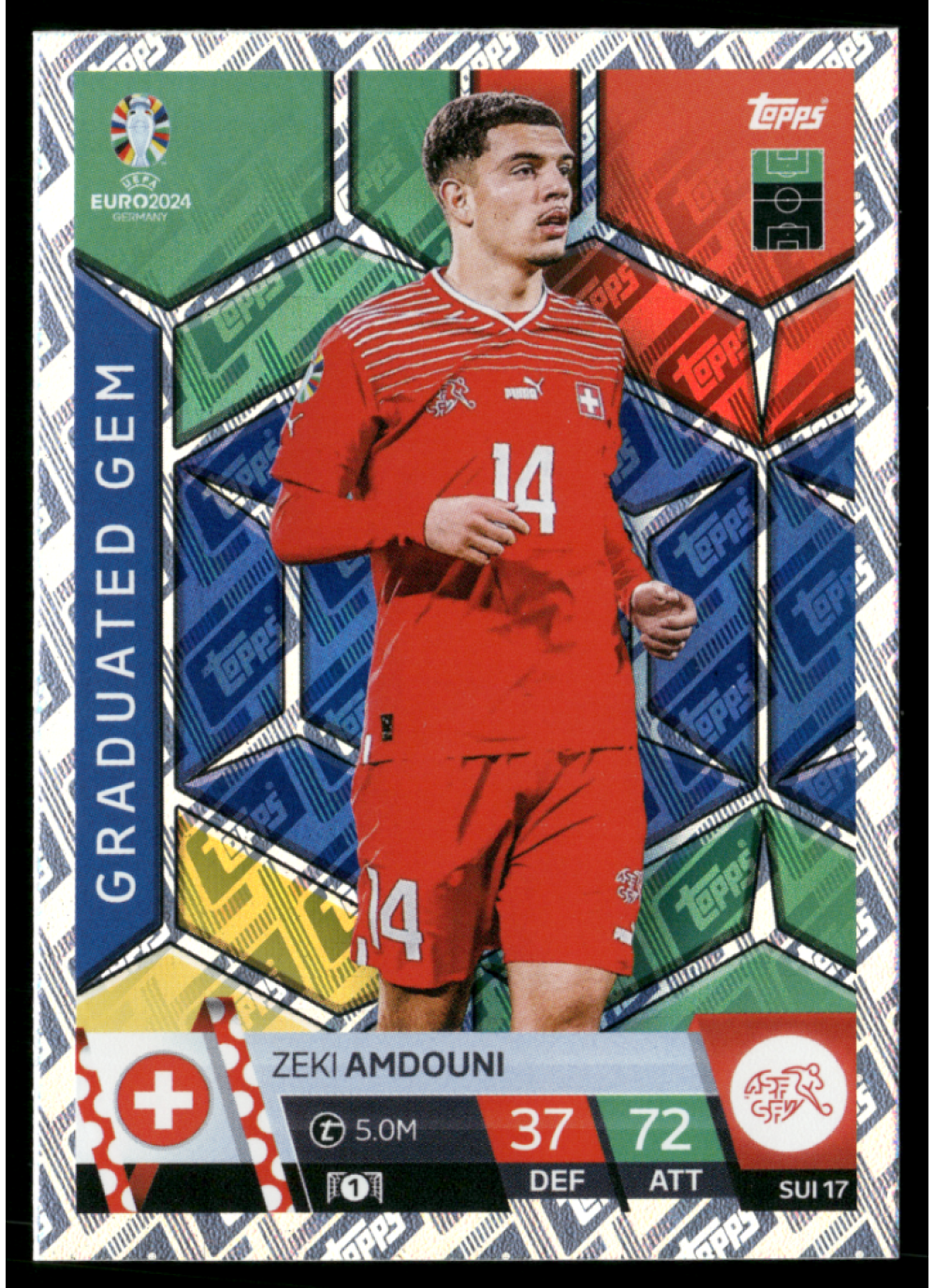 Kartička Topps Match Attax UEFA EURO 2024, #sui17, představuje Zeki Amdouniho, talentovaného hráče švýcarského národního týmu. Tato kartička je součástí sběratelské edice pro sezónu 2024, která zahrnuje nejlepší hráče a týmy z evropského fotbalu.