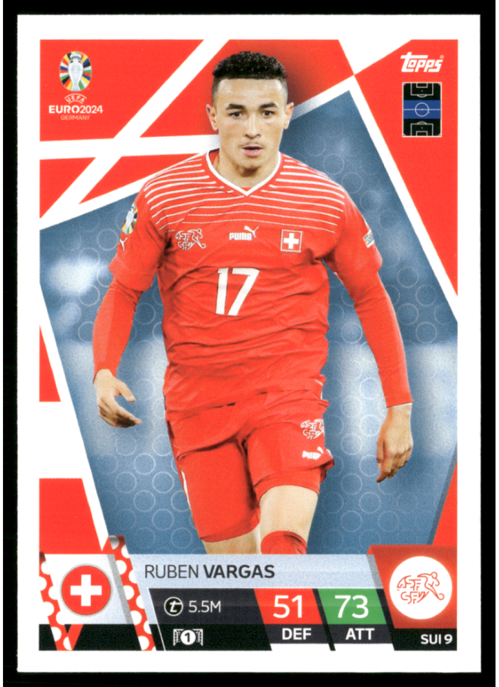 Kartička Topps Match Attax UEFA EURO 2024, #sui9, představuje talentovaného hráče Rubena Vargase, který se proslavil svými výkony na evropské scéně. Tato kartička je součástí sběratelské edice, která zachycuje klíčové momenty a hráče z turnaje UEFA EURO 2024.
