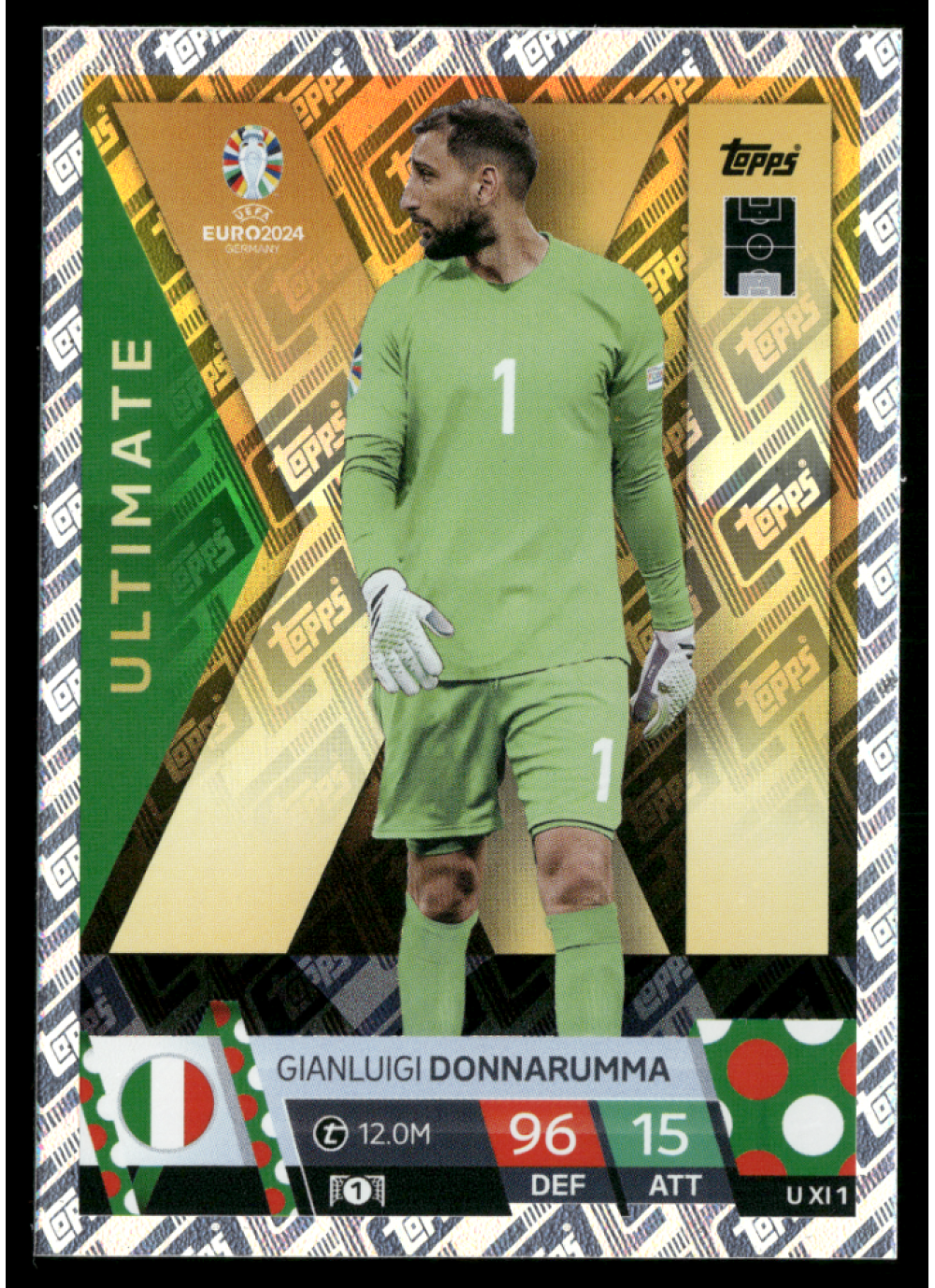 Kartička Topps Match Attax UEFA EURO 2024, #uxi1, představuje jednoho z nejlepších brankářů současnosti, Gianluigi Donnarummu. Tato kartička je součástí sběratelské edice, která zachycuje klíčové hráče a momenty z mistrovství Evropy 2024.