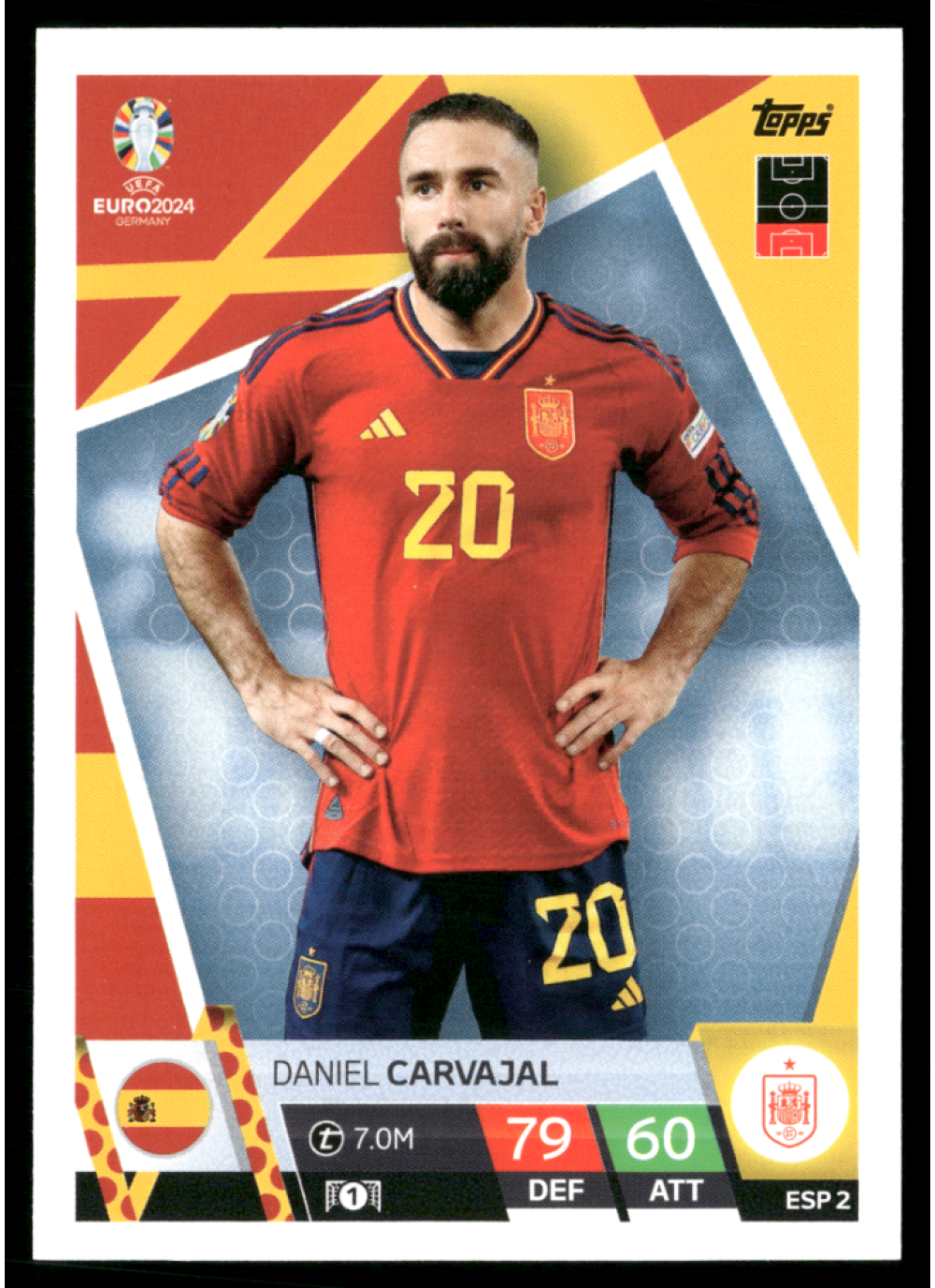 Tato kartička Topps Match Attax UEFA EURO 2024, označená jako #esp2, představuje talentovaného hráče Daniela Carvajala. Je součástí sběratelské edice, která zachycuje nejlepší momenty a hráče evropského fotbalu. Carvajal, známý svými vynikajícími obrannými schopnostmi a rychlostí, je klíčovým hráčem španělského národního týmu.
