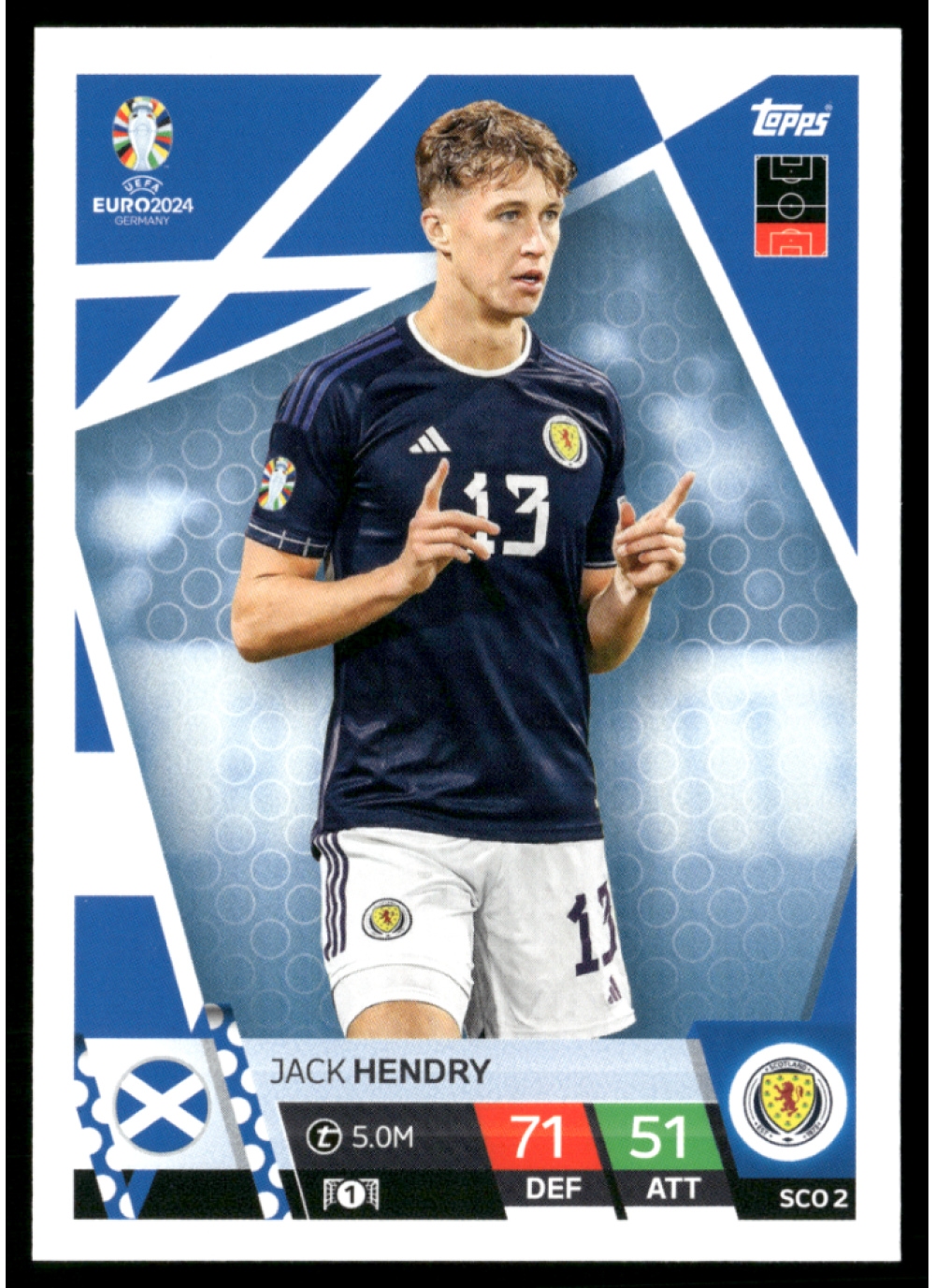 Kartička Topps Match Attax UEFA EURO 2024, #sco2, představuje talentovaného hráče Jacka Hendryho, který je klíčovým členem skotského národního týmu. Tato kartička je součástí sběratelské edice pro sezónu 2024, která zahrnuje širokou škálu hráčů a týmů z celého evropského fotbalu.