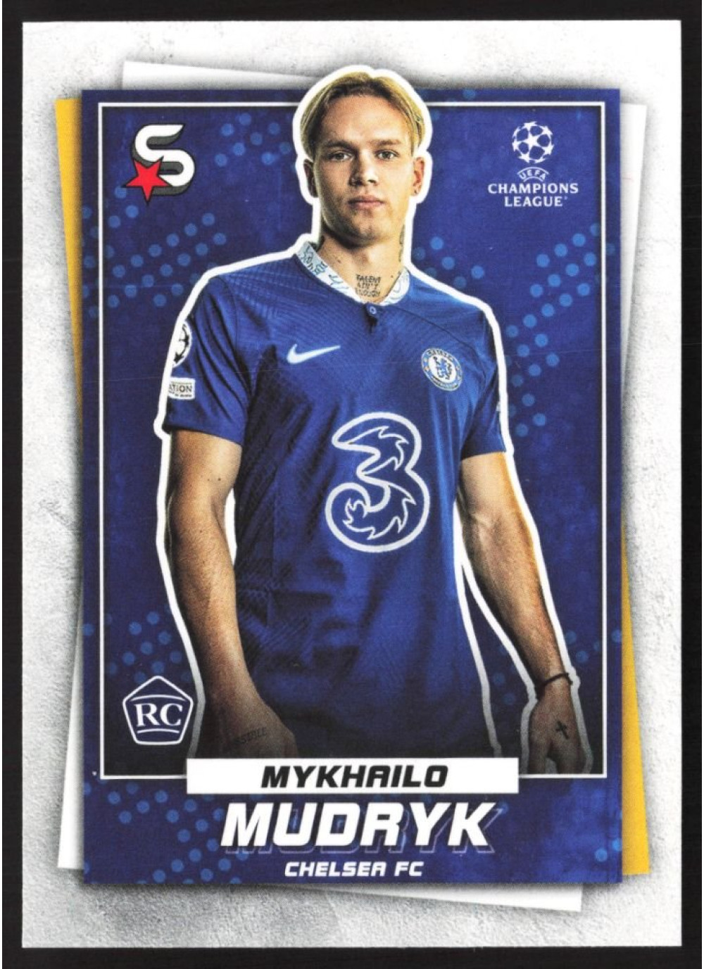 Tato kartička z edice 2022-23 Topps Superstars UEFA Club Competitions, #23, zachycuje Mudrykovu dynamiku a talent na hřišti. Je součástí sběratelské série, která oslavuje nejlepší hráče v evropských soutěžích.