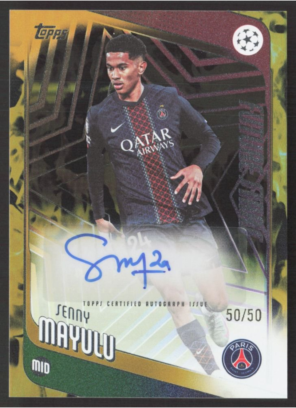 Tato unikátní kartička Sennyho Mayulu z edice 2025-26 Topps UEFA Club Competitions je skvostem pro každého sběratele. S limitovanou edicí pouze 50 kusů, tato karta s podpisem představuje nejen vzácný artefakt, ale také skvělou investici do budoucna.