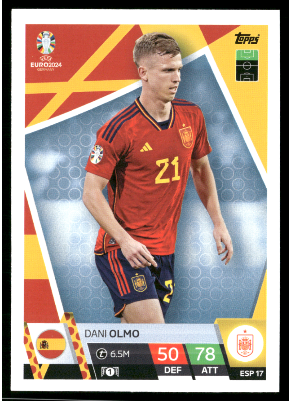 Dani Olmo je španělský fotbalista, který hraje na pozici záložníka. Je známý svými technickými dovednostmi a schopností tvořit hru. Jeho výkony na mistrovství Evropy 2024 přispěly k úspěchům španělského týmu a jeho kartička je vysoce ceněná mezi sběrateli.