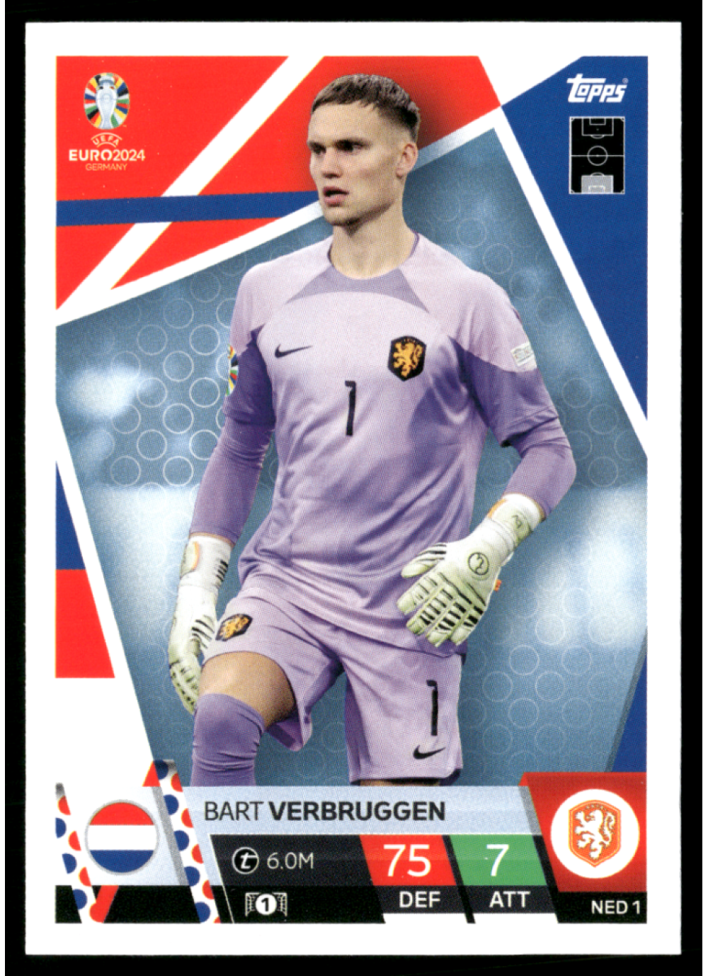 Kartička Topps Match Attax UEFA EURO 2024, #ned1, představuje jednoho z nejvýznamnějších hráčů turnaje, Bart Verbruggen. Tento talentovaný brankář se stal klíčovým hráčem pro svůj tým a jeho kartička je must-have pro každého sběratele.